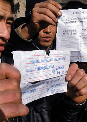 | 近年來,企業職工收入分配“強資本、弱勞工”的狀態十分突出,因而民工欠薪問題屢屢出現。圖為幾位農民工正在出示他們的欠款“白條”。新華社記者