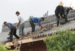 5.12地震使甘肅省隴南市成縣遭受重大損失。目前,全縣災后重建工作全面展開,在廣大農村興起了建房熱潮。5月31日,甘肅省隴南市成縣紅川鎮韓莊村的村民在建新房。新華社發 燕海潮 攝