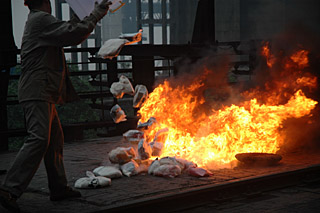 6月22日,重慶鋼鐵廠的工人將毒品倒入焚燒爐入口。這是重慶首次以環保方式焚燒毒品。 與過去露天公開焚燒毒品的方式相比,采用鋼鐵廠的焚燒爐焚燒毒品,所排出的煙氣和粉塵不含毒品成分,符合焚燒爐排放標準,最大限度降低了對環境的影響。新華社記者