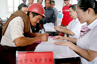 | 瑞安市農業合作銀行的工作人員為農戶辦理貸款手續,首批12戶低收入農戶得到了23.8萬元的無息創業貸款。(資料照片) | 如何解決貧困農民融資難,貧困地區一直苦無良策。近年寧夏回族自治區在部分貧困鄉村探索建立村級發展互助資金,各級財政先期無償注入資本金,通過農戶自愿入股方式吸收聚集民間資本,以小額信貸方式有償發放,既緩解了貧困農戶發展生產資金短缺的問題,又創新了財政扶貧資金的使用和管理方式。 寧夏扶貧辦副主任馬崇林向記者算了一筆賬,農民使用互助資金需支付占用費,支付率低于同期農村信用社小額支農貸款利率。年終決算,占用費收入的40%滾入本金,60%用于分紅和提取管理費用。如果能夠形成良性循環,可以利用的資金將會越來越多,互助金也將成為更多貧困農民的“草根銀行”。