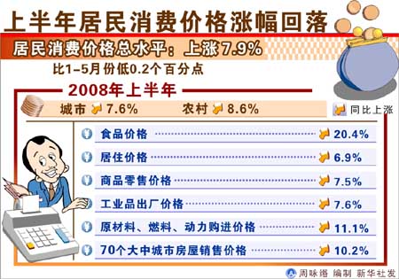 “第一是國際因素”,李曉超在上半年國民經濟運行情況新聞發布會上說。今年以來,世界各國價格可以說是普遍上漲。近兩個月,包括發達國家、發展中國家的CPI都在沖高,有些達到了十多年以來的較高水平。 同時,國際初級產品特別是石油和糧食的價格,今年以來增長都在30%以上。據有關國際組織統計,6月份國際能源價格環比上漲8%。其中,石油上漲7.2%,煤炭上漲19.9%。在我國開放度越來越大的形勢下,國際因素的影響是非常大的。 第二,生產價格漲幅繼續擴大,對CPI也形成了較大的傳導壓力。5月份工業品出廠價格上漲了8.2%,6月份漲幅進一步擴大到8.8%。而近期成品油和電價的上調,災后重建形成對建材的需求,都可能形成價格上漲的一些新因素! 第三,通貨膨脹預期還比較強。雖然近兩個月隨著居民消費價格水平的回落,社會公眾對價格上漲的預期比前一段較為穩定,但在當前國內外特別是國外價格上漲較快的形勢下,社會公眾容易產生價格繼續上漲的預期。 第四,下半年價格上漲的翹尾因素還比較高。據初步測算,下半年價格翹尾因素將影響居民消費價格上漲1.8個百分點。 數字表明,上半年我國居民消費價格漲幅回落,CPI同比上漲7.9%,比1至5月份低0.2個百分點。其中,6月份上漲7.1%,比上月回落0.6個百分點,環比下降0.2%。