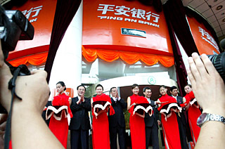 | 2005年7月5日,記者在上海常熟路拍攝平安銀行總行遷址剪彩儀式。當日,由平安保險集團和匯豐銀行兩大金融機構持股的平安銀行總部正式落戶上海。新華社記者