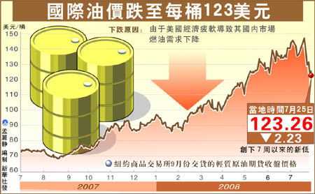 7月25日,國際幾大石油交易市場的表現創下了一段時間以來的價格新低。當天,紐約商品交易所9月份交貨的輕質原油期貨價格開盤后一路下跌,觸底至每桶122.50美元,收盤時報于123.26美元,比前一個交易日下跌了2.23美元。倫敦國際石油交易所9月份交貨的北海布倫特原油期貨價格下跌1.92美元,收于每桶124.52美元。 此外,紐約商品交易所8月份交貨的汽油期貨價格每加侖下跌2.71美分,收于3.0323美元;8月份交貨的取暖油期貨價格每加侖下跌4.42美分,收于3.5229美元;8月份交貨的天然氣期貨價格每千立方英尺下跌19.9美分,收于9.084美元。 業界普遍認為,此輪油價回落是由于美國經濟疲軟導致其國內市場燃油需求下降。美國能源部上周發布報告顯示,目前美國國內市場對燃油的平均日需求量降到了2007年1月以來的最低水平。 與此同時,市場初步估算7月份石油輸出國組織(歐佩克)原油日產量比上月增加了20萬桶,緩解了投資者對原油供應的擔心。歐佩克第一大產油國沙特在過去兩個月中連續兩次增產,試圖抑制油價猛漲的趨勢。