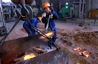 | 寧波慈溪市盛泰電子金屬材料有限公司的熔鑄車間,一些工人在工作。浙江省企業狠抓內部節能管理,有效降低成本。新華社記者