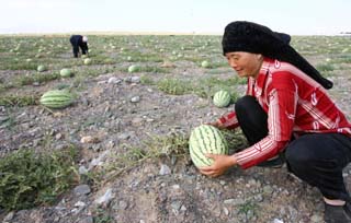 記者在一片瓜田看到,一群小伙子正在把農用車上的硒砂瓜搬運到貨車上碼放整齊。這是香山鄉紅圈村瓜農王學勇的重慶客戶。王學勇以每斤0.4元賣出,按一車25噸計算,他可以收入約1萬元。王學勇說,村里家家戶戶種西瓜,少則十幾畝,多則上百畝,一年在瓜期勞動四個月就能賺足全年的花銷還有結余,大伙種瓜的積極性越來越高。 據香山鄉黨委書記李學靈介紹,香山鄉8個行政村有7個規模種植硒砂瓜,戶均種植面積78畝。七月以來,每天都有約200輛載重20噸以上的貨車向四川、重慶、廣州、深圳、北京等地運輸約4000噸硒砂瓜。 王學勇的重慶客商說,雖然運到重慶后成本增加,售價必然高于0.8元/每斤,但重慶市民仍對寧夏硒砂瓜偏愛有佳。市民普遍反映,寧夏硒砂瓜個大、瓤紅、汁多、甘甜、有營養,可長期存放。 目前,中衛市有130多家專門從事硒砂瓜流通的公司,農民經紀人3000多人!跋闵轿肮稀币唁N往北京、上海、重慶、廣州、深圳、武漢等全國33個大中城市和香港特別行政區,穩定占領西南市場,成功開拓南方市場,外銷量達到90%以上。2008年,“香山硒砂瓜”取得北京奧運會指定采購權,為其走出國門提供了絕佳機會。 日前舉行的“寧夏中衛硒砂瓜洽談會”上,來自全國9個省區的18家流通企業對“石頭縫里長出的硒砂瓜”表現出濃厚興趣,與瓜農簽訂了總計21.84萬噸的硒砂瓜購銷協議,占今年估算總產值的六分之一。 硒砂瓜不僅是石頭縫里長出的奇異果,更是寧夏干旱帶農民心頭的希望瓜。站在一望無垠的瓜的海洋中,誰不感嘆旱塬變綠田的神奇。 |