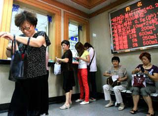 9月2日,一些患者在上海市普陀區某公立醫院藥房取藥。2008深化醫院管理年活動暨全國醫政工作會議傳出信息,我國將選擇部分城市進行公立醫院改革試點,要改革以藥養醫機制,有效降低群眾醫藥負擔。