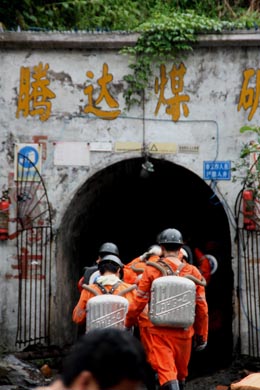 云南彝良煤礦瓦斯爆炸事故導致5人死亡。9月10日,救援隊伍下井搜救被困人員。新華社發(張廣玉