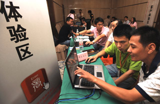 浙江啟動“百場萬企”電子商務系列培訓。9月10日,工作人員(前右二、右四)在培訓浙江的中小企業負責人運用網絡做生意。新華社記者:譚進