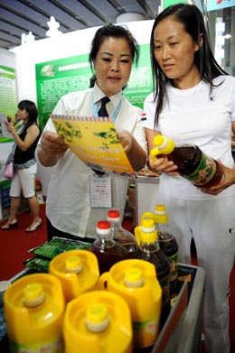 西部少數民族特產勇闖中博會。9月23日,來自貴州省綠原食品開發有限公司的業務員在展會上向客商推介野生刺梨果汁。新華社記者:周文杰