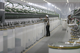 | 浙江長興縣威達紡織集團工人正在操作先進的自動化設備。威達紡織集團擁有國際最先進的德國Autocoro312型氣流紡設備,年產各類紗線10000噸,產品遠銷歐洲、美國、日本、巴基斯坦、土耳其、香港等地。新華社記者