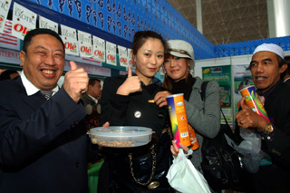 10月10日,馬來西亞客商(左一)正在給西寧市民推銷本國清真食品。當日,2008中國(青海)國際清真食品及用品展在西寧舉行,來自馬來西亞、摩洛哥、伊朗、沙特、印尼、新加坡等16個國家和地區的近200名專業客商和國內20個省區市的300多家企業與會。