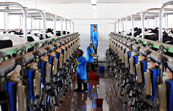 | 黑龍江省八五七農場一奶牛場,工人們在車間工作。新華社記者 王建威