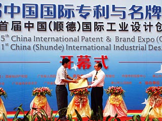 | 國家工業設計與創意產業基地9月落戶廣東順德。廣東佛山順德區副區長蘇偉波(左)從國家知識產權據副局長張勤(右)手中接過“國家工業設計與創意產業(順德)基地”牌匾。本報記者