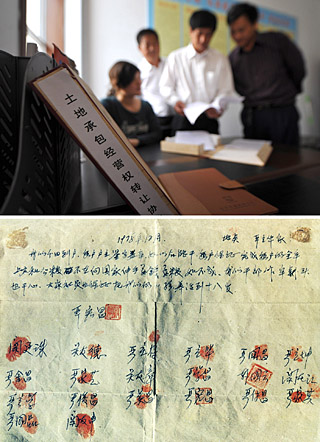 | 30年前,安徽省鳳陽縣小崗村的18位農民在一紙分田到戶“大包干”生死契約上按下鮮紅的手印,從此拉開了中國農村改革的序幕。近年來,小崗村開始進行以承包制為基礎的土地流轉制度改革,開展多種形式的土地集中經營,探索致富之路。 |