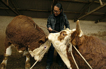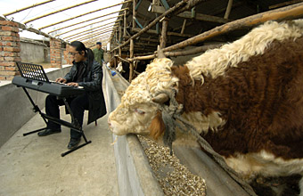 “禿頭,乖,別動”,劉海川一邊梳毛,一邊不停地給禿頭說話。禿頭是劉海川養牛場的一頭牛,因為沒長角,被他稱作禿頭。與禿頭一樣,這里的幾十頭牛都有自己的名字,“我都把它們當成自己的孩子,時間長了一喊名字,它們就有反應”,劉海川說。 劉海川的養牛場不大,但很特別,每個牛圈都安裝了音箱,這讓禿頭和其它幾十頭牛每天能聽到美妙的鋼琴曲。每當《梁!返葍灻赖那禹懫,這些牛變得溫順,用劉海川的話說“牛脾氣不見了,好管理了”。 2007年5月開辦養牛場后,劉海川遇到過問題,但勤奮好學的他每次都能找到解決辦法。 一次偶然的機會,長時間不彈鋼琴感覺技癢的劉海川在養牛場彈鋼琴,彈著彈著,他發現聽到琴聲后,安靜的牛群有了動靜。伴隨著激昂或柔美的琴聲,牛群時而狂躁,時而悠閑。 查閱大量資料后,劉海川發現,在國外早就有飼養員給牛聽音樂的事例。從那以后,每逢晴天,劉海川就把鋼琴搬到院里,給牛彈各種柔美的曲子。天氣變冷,劉海川擔心鋼琴長時間在戶外不利于保養,就在各個牛圈里裝上音箱,每天定時給牛群播放鋼琴曲。 一段時間后,“對牛彈琴”不僅使牛聽話了,牛肉也變得更好吃了。不少客戶品嘗了劉海川的牛肉后,表示味道鮮美,F在,劉海川養的牛銷路好,每批牛都提前接到訂單,價格也不錯。