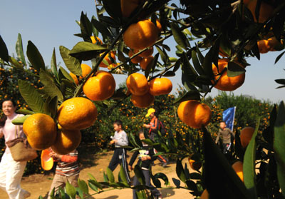 當日,2008廣西(柳城)生態蜜桔文化節暨新農村科技大集開幕,吸引眾多游人前往觀光采購,助農增收。新華社發(李斌