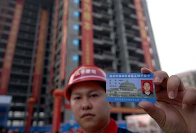 前不久,為減少重慶建設項目安全事故的發生,重慶市建委在渝北區某建筑工地進行“平安卡”管理制度試點,共培訓農民工1萬多人,發放“平安卡”6000余張。通過培訓上崗,安全事故明顯下降。圖為一名建筑工人正在展示自己使用的“平安卡”。新華社記者:劉潺