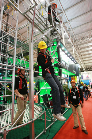 安全生產最重要。前不久,“第四屆中國國際安全生產及職業健康展覽會”在北京開幕。參觀者在展覽會上試用緊急逃生裝置。新華社記者:李明放