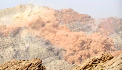 這是新疆輪臺陽霞煤田火區2號子火區爆破作業瞬間(2008年5月13日攝)。