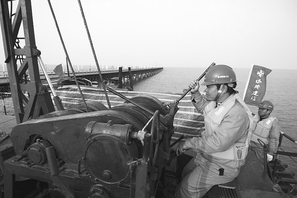 12月15日,建筑工人在吊裝世博會演藝中心鋼架結構。