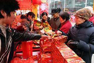 | 新春佳節將至,各地年貨市場也逐漸升溫。安徽合肥的一些大型超市前開設了專門的年貨市場供市民們選購。從南北干貨、各地特產,到各色糖果、節日用品。選購年貨備新年的市民絡繹不絕。新華社發(實習生
