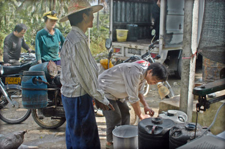 2008年12月20日,瓊海市石壁鎮的群眾正在出售膠乳。 受金融危機影響,2008年下半年以來,海南橡膠價格一路走低,目前膠價每噸降至萬元以下。為保護農民利益,海南農墾以12000元每噸的保護價收購橡膠,切實保護農民利益。新華社發(蒙鐘德攝) | 2009年春節要來臨的時候,北國大地依然處于最寒冷的季節。然而,在祖國最南端的海南省的農場里、膠園中,卻熱流涌動、激情澎湃。被譽為海南省體制改革一號工程、受到中央領導和社會各界廣泛關注的農墾體制改革,正進入了攻堅階段。 專家指出,海南農墾改革雖然在2008年成效顯著,但是由于各種復雜因素的影響,2009年改革面臨的困難可能比2008年更大。鑒于海南農墾承擔著全省經濟發展新的火車頭的戰略重任,這項改革只能成功、不能失敗。