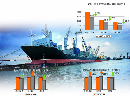 11日,海關總署公布了今年1月份的外貿數據。數據顯示,今年首月我國進出口總值為1418億美元,比去年同期下降29%。這是中國外貿進出口額連續第三個月出現下降。其中出口904.5億美元,下降17.5%;進口513.4億美元,下降43.1%。 海關的分析指出,今年1月份比去年1月份少五個工作日,如果剔除工作日的影響,1月份的出口值比去年同期增長6.8%,進出口值和進口值分別比去年同期下降8.2%和26.4%。同理,今年1月比去年12月少六個工作日,剔除工作日的影響,1月份進出口值、出口值分別比去年12月份增長4.6%和10.1%,進口值下降3.8%。 對于這樣的數據,發改委對外經濟研究所所長張燕生對媒體表示,這說明出口已出現向好跡象!案ツ甑谒募径认啾,出口應該是止跌的一個增長,1月份的數據給了我們信心。這說明我們出臺的一系列保出口、保增長的措施開始生效!彼f。 盡管如此,更多專家對于1月份的數據仍然持不十分樂觀的態度。 興業銀行資金營運中心首席經濟學家魯政委表示,盡管剔除春節因素后的出口數據有所好轉,但是進口數據仍然持續下滑!斑M口大幅下滑,預示未來出口前景悲觀?紤]到加工貿易在外貿中占有較高比重,同時不少即使未被列入加工貿易的出口品上游原材料和燃料也多需要進口,進口的超預期下滑,預示著未來出口將繼續疲軟! 社科院世界經濟與政治研究所國際貿易研究室主任宋泓也表示,從1月份總體數據來看,整體經濟受到外部影響的態勢沒有發生改變,這主要反映在我國對主要貿易伙伴的貿易總額仍在大幅下降。 數據顯示,在我與主要貿易伙伴的雙邊貿易中,1月,中歐雙邊貿易總額為279.3億美元,下降18.7%;中美雙邊貿易總值為222.5億美元,下降15.2%;中日雙邊貿易總值為145億美元,下降28%!拔覈M出口60%以上的份額集中在與這三個伙伴的貿易中,目前他們自身經濟都深陷泥潭,我國出口勢必受到很大影響! “去年8月份以來,我國先后四次上調了部分商品的出口退稅率,但是政策的效果仍然有限,外需不振是對出口造成沖擊的主要原因,想扭轉目前的貿易格局僅靠出口退稅不行!敝型蹲C券宏觀經濟分析師邢微微表示。 從出口商品分類的具體數據來看,盡管服裝出口、鞋類產品出口和箱包出口均有不同程度的增長,但是占我國出口總值54.3%的機電產品出口為491.4億美元,下降了20.9%。另外,電器及電子產品出口181.2億美元,下降28.3%;機械及設備出口169.4億美元,下降16%;高新技術產品出口216.6億美元,下降28%。 “與服裝紡織類產品相比,機電、電子類產品是技術密集型,并且是高收入彈性,也就是說,這類產品主要是出口到更高收入的發達國家。而目前,美歐這類發達國家受到金融危機的影響最大。因此,這類產品的出口一定會受到更大程度影響!彼毋f。 “目前,對于全年外貿形勢的判斷還不好說,因為這主要還是要看外部環境恢復得如何!彼毋f。而魯政委預測,2009年中國出口會下跌5.5%,進口還會下跌11.5%。