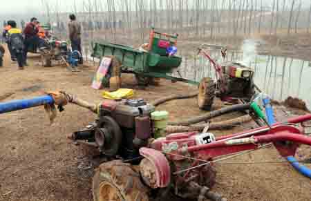 小農機發揮大作用。2月6日,在河南省洛陽市伊川縣鳴皋鎮武莊村,村民把手扶拖拉機集中在一起準備抽水澆灌麥田。新華社記者:王頌 攝