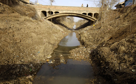 陜西關中麥區見聞——大型灌區“帶病運行” 小型水利“仍吃老本”。圖為陜西省渭南市大荔縣許莊鎮境內渠道破損、淤積嚴重的洛惠渠灌區東干渠。新華社記者:陳鋼 攝