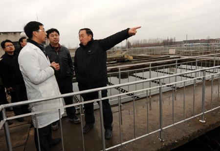 2月22日,張志敏(中)在聽取鹽城市城西水廠廠長張壽華(左)匯報污染事故發現經過。 當日,國家環保部應急與調查中心辦公室主任張志敏帶領調查組來到水源地受污染的鹽城市城西水廠,調查受污染自來水流入供水管網的原因。 2月20日上午,由于自來水水源受到化工污染,江蘇省鹽城市區發生大范圍斷水,至少20萬居民的生活受到影響。