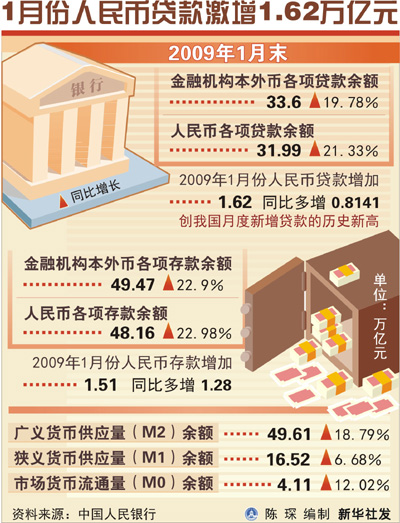 2009年1月份人民幣貸款激增1.62萬億元[圖]