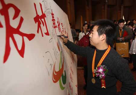 首屆“中國十佳大學生村官”頒獎典禮上,“中國十佳大學生村官”獲得者在《創業新農村,奉獻寫青春》倡議書條幅上簽名。新華社記者:袁滿 攝