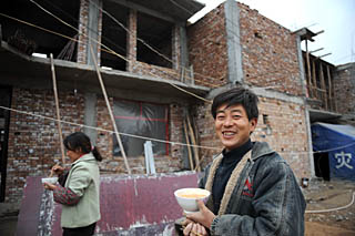 這是2008年11月21日,甘肅省隴南市武都區馬街鎮“感恩村”村民李旭德(右)在自家正在建設的二層小樓房前吃午飯。新華社記者 聶建江