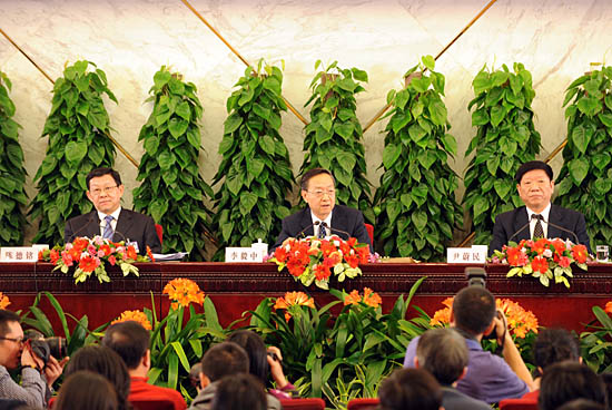 | 3月10日,十一屆全國人大二次會議舉行記者會,工業和信息化部部長李毅中、人力資源和社會保障部部長尹蔚民、商務部部長陳德銘答記者問。新華社記者