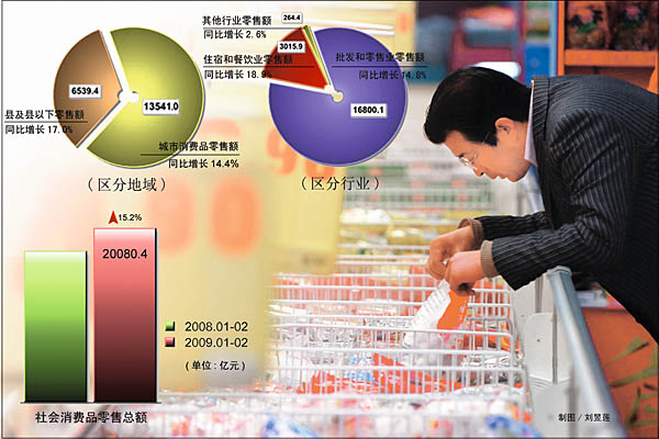 國家統計局12日公布,今年1至2月,社會消費品零售總額20080.4億元,同比增長15.2%。增長幅度較去年同期下降5個百分點,較去年全年下降6.4個百分點,經過自2007年12月起13個月超過20%的高增長后,首次回落至20%以下。 具體指標也可謂是全線下跌:城市消費品零售額13541.0億元,同比增長14.4%,增幅分別較去年同期下降6.4個百分點,較去年全年下降7.7個百分點;縣及縣以下零售額6539.4億元,增長17%,增幅分別下降1.9個百分點和3.7個百分點;批發和零售業零售額16800.1億元,同比增長14.8%,增幅下降5.2個百分點和6.7個百分點;住宿和餐飲業零售額3015.9億元,增長18.9%,增幅下降4.2個百分點和5.8個百分點。 不過從結構上看,縣及縣以下消費品零售額同比增長幅度快于城市,是近一年多來的首次。 分商品類別看,限額以上批發和零售業吃、穿、用商品類零售額同比分別增長14.2%、15.9%和7.6%。其中,糧油類增長16.3%,肉禽蛋類增長12.0%,服裝類增長17.4%,文化辦公用品類增長8.3%,體育、娛樂用品類增長13.5%,日用品類增長12.0%,家用電器和音像器材類增長2.7%,家具類增長27.1%,化妝品類增長14.6%,金銀珠寶類增長16.3%,汽車類增長9.3%,石油及制品類增長0.7%,建筑及裝潢材料類增長22.4%,通訊器材類下降9.2%。