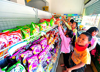 | 3月11日,大密羅村的幾名小學生在村中“小超市”購買小食品。云南省玉溪市供銷系統所屬百信商貿集團,從2008年開始,補貼相關費用在該市農村建立村級“小超市”!靶〕小辈扇〗y一價格、統一標識、統一物流配送及售賣方式,按批發價向村民零售貨物,農民足不出村,即可買到實惠的日常用品。目前,這種鄉村“小超市”已經覆蓋了玉溪市約25萬農村消費人群。新華社記者