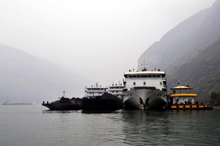 4月1日,船只?吭陂L江三峽小平善壩臨時待閘錨地。新華社發(黃翔 攝)