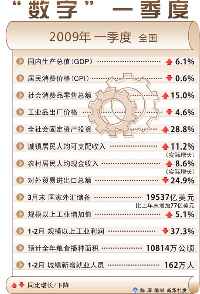 國家統計局16日公布的一季度經濟運行數據顯示,2009年一季度我國GDP增速為6.1%,今年一季度的經濟增長率比去年四季度回落了0.7個百分點,而去年四季度比三季度回落了2.2個百分點,經濟大幅下滑之勢明顯收斂。 根據國家統計局測算,一季度6.1%的經濟增速中,4.3個百分點來自消費,2個百分點來自投資,而出口的貢獻為負0.2個百分點。投資增速和社會消費品零售總額實際增速“雙加快”,支撐起國際金融危機沖擊下的中國經濟增長。 一季度,全社會固定資產投資同比增長28.8%,比去年同期加快了4.2個百分點。其中,新開工項目計劃總投資增長87.7%,鐵路投資增長102%。這說明,從去年底開始實施的4萬億元投資計劃的效應正在逐步顯現,新項目密集開工,基礎設施投資猛增。 國家統計局新聞發言人李曉超說,中央擴大投資的政策效果將繼續發揮作用。去年中央擴大投資的1000億元已全部落實,今年初的1300億元投資計劃也已下達了1100億元。未來投資仍會保持快速增長勢頭。