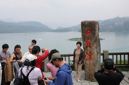 一群來自上海的游客在臺灣“日月潭”字碑前排隊留影。新華社記者 余福卿 攝 |
