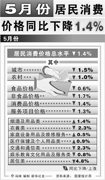 國家統計局6月10日公布,5月份,我國居民消費價格總水平(CPI)同比下降1.4%,環比下降0.3%,同比跌幅縮小0.1個百分點,環比跌幅擴大0.1個百分點。