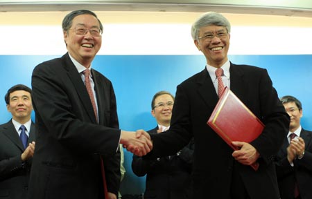 6月29日,中國人民銀行行長周小川(前左)和香港金融管理局總裁任志剛在備忘錄簽署儀式上。當日,內地與香港跨境貿易人民幣結算業務備忘錄在香港簽署。新華社記者
