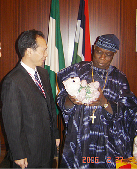 越美集團總裁徐志明向尼日利亞總統贈送禮品。 |