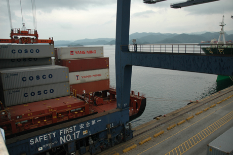 8月17日下午,深圳捐助給臺灣災區的首批100套活動板房從深圳鹽田港啟運,滿載著大陸人民的深情厚誼駛向臺灣高雄港。臺風“莫拉克”使臺灣遭遇50年來最嚴重的水災,為幫助受災的臺灣中南部地區,深圳市委、市政府決定向臺灣捐贈1000套活動板房,面積5萬多平方米,總價值近2000萬元人民幣。圖為裝載活動板房、即將從深圳鹽田港啟運的貨船。