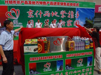 8月31日,什邡進京銷售的農產品及地方特色產品在啟動儀式上亮相。 當日,“什邡市農產品及地方特色產品進京”啟動儀式在北京舉行,首批到京銷售的產品包括10個系列50多個品種,價值1000多萬元。這項活動是北京援建地震災區的一項新舉措,既可以支持什邡全面恢復生產、增加農民收入,也為北京市民提供了優質的商品。