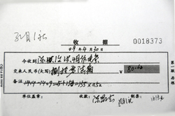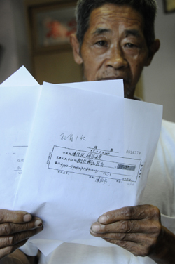 重慶江津區李市鎮孔目村一社的一名電費收費員,手持農民的電費繳納單據。上面顯示著孔目村一社農民陳治洪,2009年6月共用電7度,卻分攤了164度電的損耗,實際繳納電費88.9元,平均每度電12.7元。 |