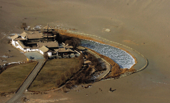 作為庫姆塔格沙漠東部邊緣的一個綠洲,干旱、缺沙和沙漠化,一直嚴重威脅著敦煌的生態環境。據敦煌市水利等部門觀測,1975年至2001年,敦煌綠洲地下水位下降了10.77米,每年以0.24米的速度在下降。由于水資源短缺和地下水位下降,敦煌市原有的1萬畝咸水湖和千余畝淡水湖的80%已不存在,大面積天然林和濕地也在逐年萎縮。蘭州大學公布的一項調查研究表明,沙漠化已對敦煌境內文物古跡造成嚴重威脅,許多重要文物遺址處在重度和中度沙漠化地帶,一些文物遺跡已經受到嚴重危害。