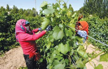騰格里沙漠邊的武威市石羊河林場,53歲的康永水頂著烈日在一處釀酒葡萄基地里勞作。他熟練地掐去頂枝、打掉偏杈,汗水順著他的臉頰不斷流下,而他的后背早已濕透。