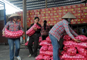 10月11日,在廣西憑祥市浦寨邊貿點,從事邊貿生意的越南水果批發商在搬運產自中國河北的水果。新華社記者