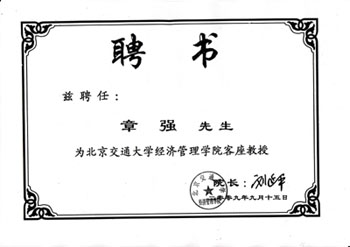 北京交通大學于2009年09月15日聘任民間股王宏皓(章強)為該校的客座教授。