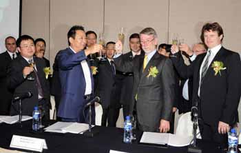 10月19日,四川漢龍(集團)有限公司與澳大利亞鉬礦有限公司在香港正式簽署股權認購及合作開發框架協議。漢龍礦業出資2億美元,收購澳大利亞鉬礦有限公司55.3%股權,成為其控股股東,并通過融資方式提供5億美元資金開發澳大利亞鉬礦有限公司全資擁有的世界級大型鉬銅伴生礦SpinifexRidge項目。新華社記者 宋振平 攝 |